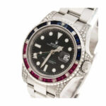 The Rolex GMT-Master II 116718LN is a luxurious replica watch with a 904L stainless steel case and a black dial. It is powered by an automatic Rolex caliber 3186 movement with a 70-hour power reserve and a precision of (-3/+3 sec/day) within COSC certification limits. The case is 40.00 mm thick and is gem-set with a 904L stainless steel bezel. The bracelet is an adjustable oyster-style 904L stainless steel with a fold clasp. The dial features stick/dot indices and stick hands made of 904L stainless steel. The watch has a water resistance of 30m and is covered by a 2-year international warranty.